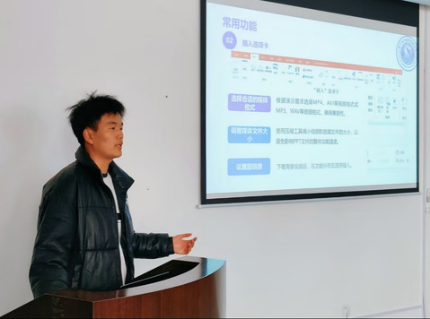 培训会紧密结合学生工作实际需求,由来自不同部门的四位同学担任主讲,分模块进行了系统讲解。综合办公室王颖、生活权益部张哲源、就业实践部赵庆臣以及新媒体中心李思彤分别讲解了Word文档的高级排版技巧;数据筛选、公式应用及图表生成等数据处理方法;聚焦PPT演示文稿,分享了设计原则、动画效果设置与高效制作流程以及新闻稿的撰写规范、要点以及公众号文章的编辑与美化技巧。