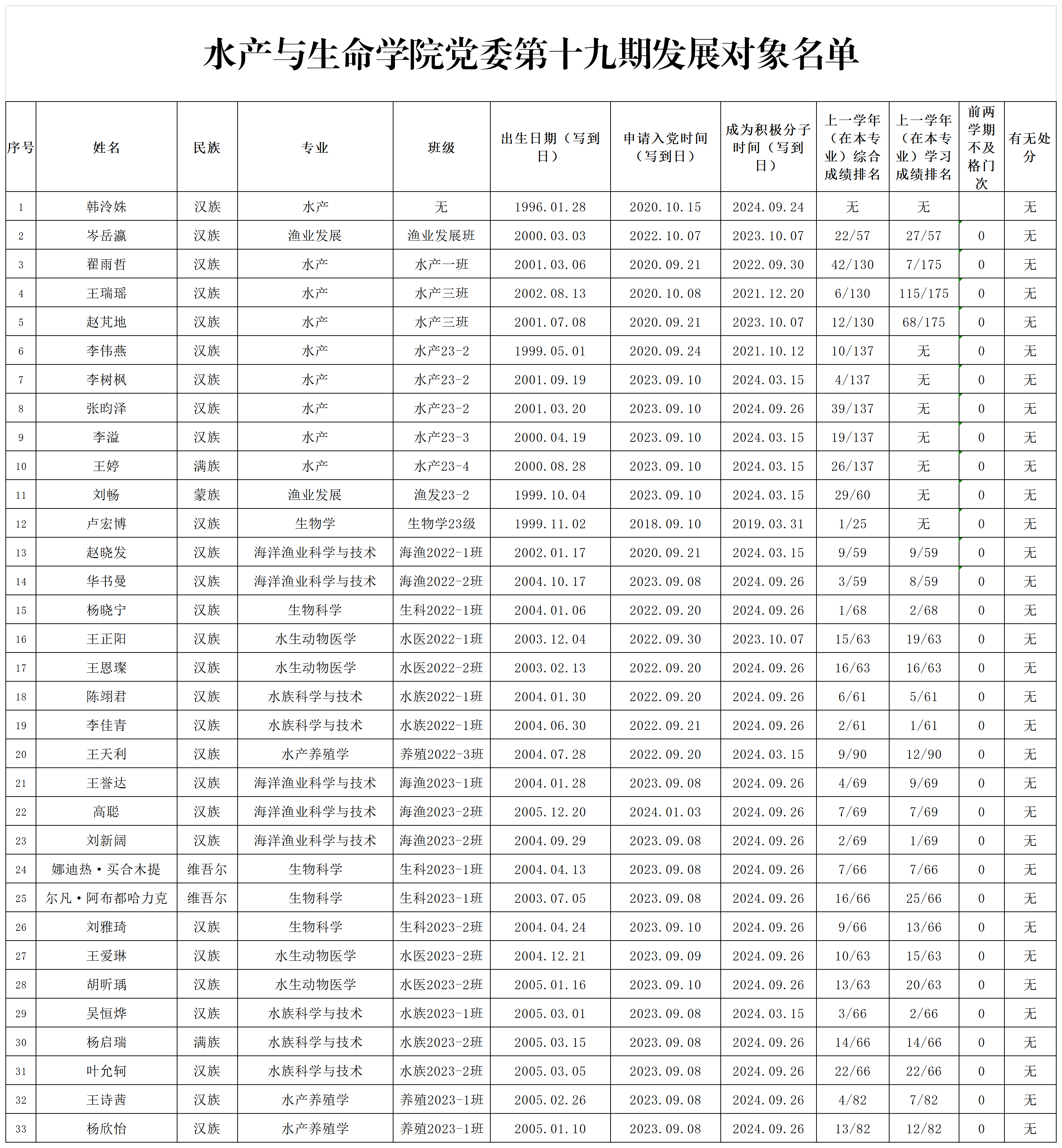 根据《大连海洋大学发展党员工作细则》有关要求,经水产与生命学院党委研究,报校党委组织部和综合监察室备案通过,将韩泠姝等33名同志列为第十九期发展对象。现将有关情况予以公示。公示时间为2025年10月28日至2025年10月30日(公示期为3个工作日)。公示期内如对公示对象有异议,可通过来电、来信或来访方式向学校及学院反映。反映问题要求实事求是,客观公正。以个人名义反映问题的,要签署本人真实姓名。