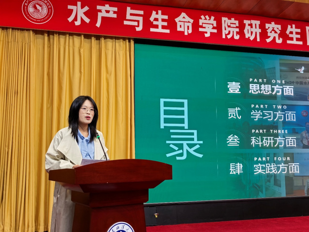 最后,刘海静同学以“行而不辍、未来可期”为题,分别从思想、学习、科研和实践方面进行经验分享。作为党员和研究生党支部组织委员的刘海静同学始终以高标准践行初心使命,在学业上,她秉持着“学而不厌,持之以恒”的态度,综测排名稳居年级第一;在科研领域,刘海静深耕水产动物营养与饲料方向,成果丰硕;实践中,刘海静将理论与实际紧密结合,她认为实践需精准择选、深度参与,才能实现学用转化,让专业能力真正服务产业需求。她鼓励大家利用碎片时间积极参与实践活动,从而可以全方位的提升个人素质。